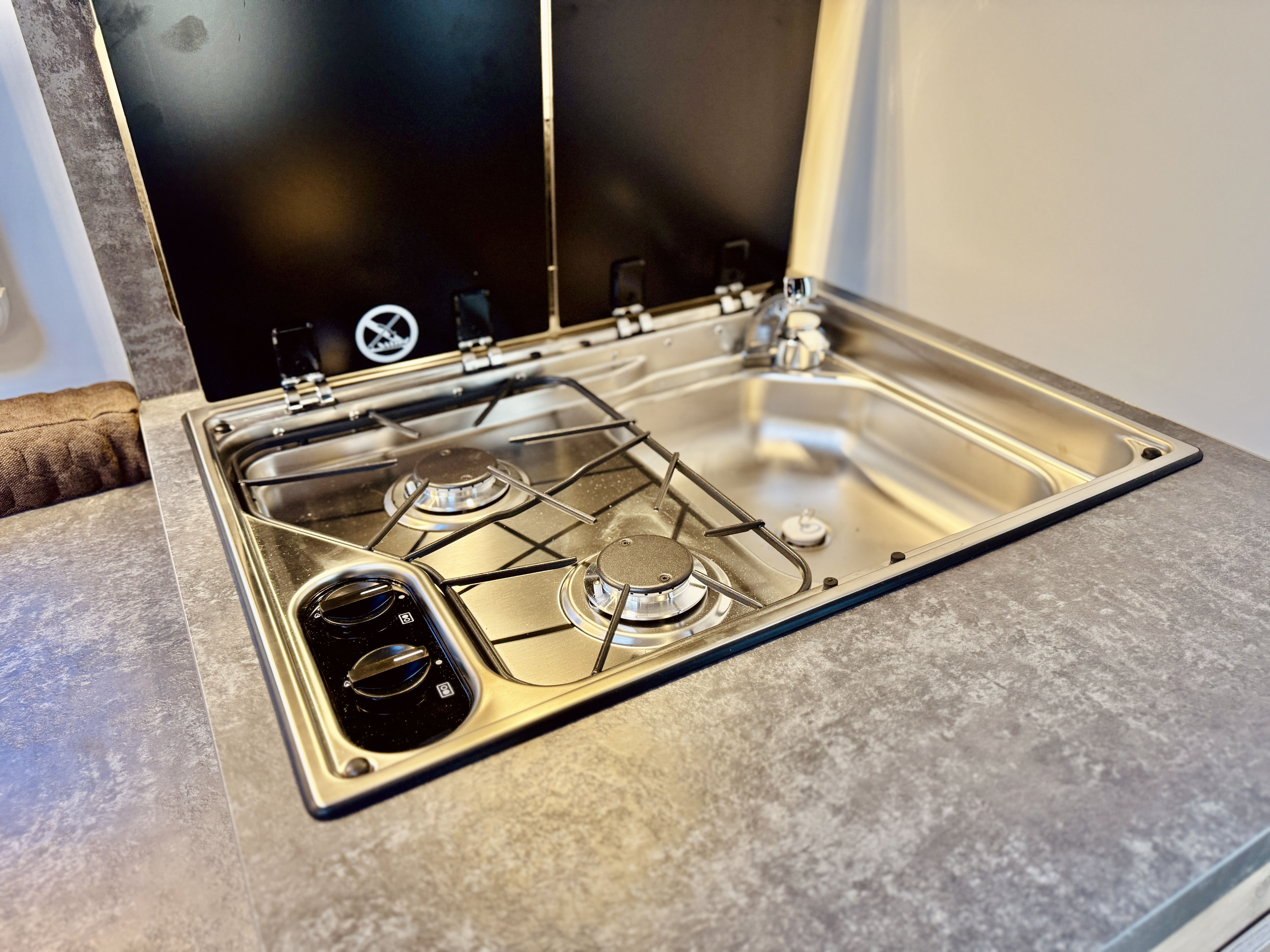 - Küche mit Dometic 2-Flammen Gaskochfeld und Spüle